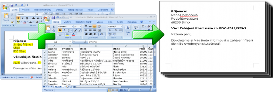 Dokumenty lze generovat dle Vámi zadané šablony, kterou lze plnit ručně přes nabídnutý formulář, hromadně daty z MS Excel tabulky nebo (nejlíp) automatickyúdaji evidovanými v rámci služby Případ.