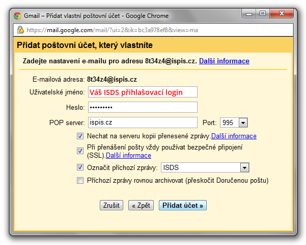 3. V dalším kroku vyplňte jako přihlašovací jméno <Váše-ID-osoby>, Vaše heslo, POP server opravte na ispis.cz, Port opravte na 995